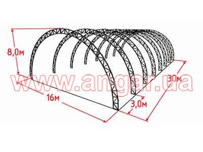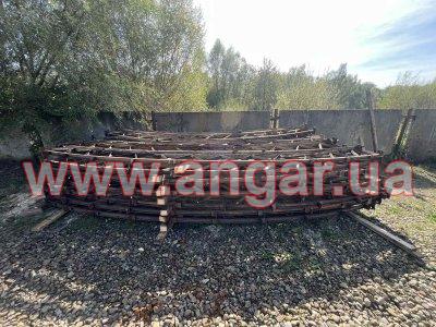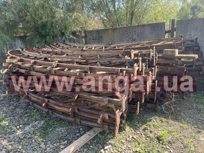 Ангар аркового типу. Демонтований каркас. Металева арка (ферма) складається з 4 сегментів. Кожен сегмент зварений з двох швелерів перерізом 65мм розварених між собою кутиком. Крок ферм 3м. Всього 11 ферм (44 сегменти). Сегменти складовані і готові до відвантаження.