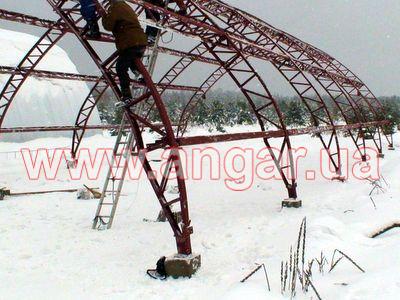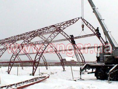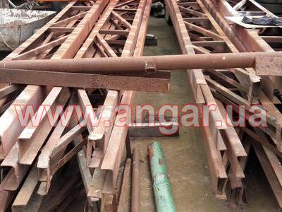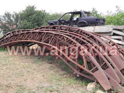 | Ангар аркового типу. Демонтований каркас. Металева арка складається з двох напівферм. Верхній та нижній пояс кожної напівферми з гнутого швелеру перерізом 120мм, розкоси з двох кутиків перерізом 30мм. Всього 6 арок. 12 сегментів. Крок арок 6м. Кріплення до фундаментів зварне через закладні пластини. Опорні пластини обрізані при демонтажі. В комплекті 5 конькових прогонів та 27 бокових прогонів. Кожен з прогонів виготовлений з двох гнутих швелерів перерізом 120мм, розкоси з двох кутиків перерізом 30мм. Каркас ангару складований і готовий до відвантаження. |