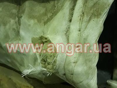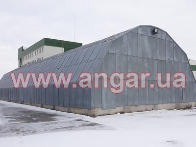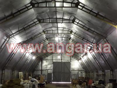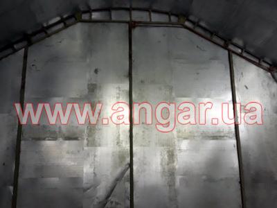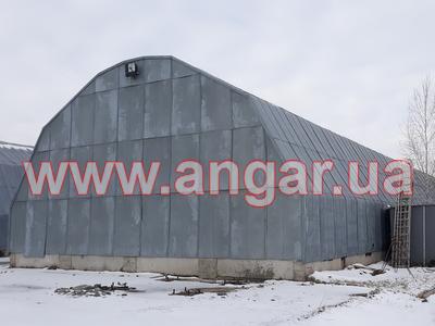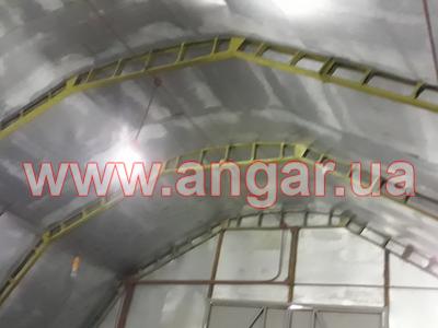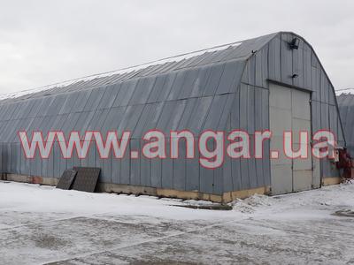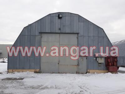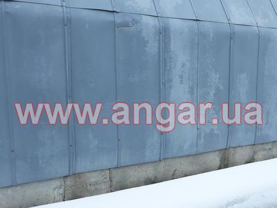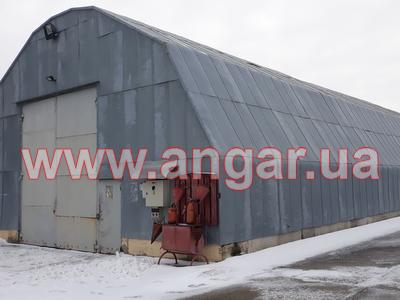 | Ангар аркового типу. Встановлений в повній комплектації. Металева арка складається з трьох сегментів. Верхній, нижній пояс та розкоси кожного з сегментів зі швелеру перерізом 100мм. Всього 13 арок (39 сегментів.) кріплення сегментів між собою на болтах, кріплення сегментів до фундаментів - зварне. Обшитий оцинкованим листом в два шари, між якими знаходиться утеплювач в матах з мішковини. Зовнішній лист товщина 1мм, внутрішній лист товщина 0,6мм. Дерев’яний брус перерімо 50х70мм. Одні торцеві ворота розміром 4,0х4,4м. |