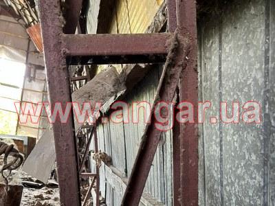 Ангар аркового типу. Встановлений розукомплектований. Металева арка (ферма) складається з 4 сегментів. Кожен з сегментів зварений з двох швелерів перерізом 80мм, які розварені між собою кутником. Всього 11 арок (44 сегменти) В комплекті 8 торцевих колон. Обшитий профлистом. Не вистачає 20-25 листів.