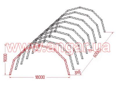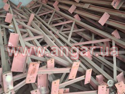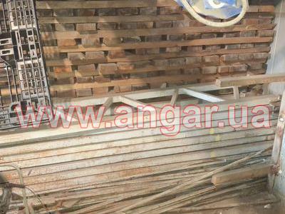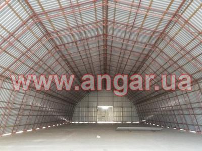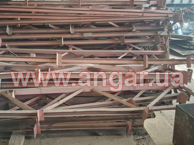 | Ангар аркового типу. Демонтований в повній комплектації. Аркас складається з шести сегментів. Верхній та нижній пояс кожного сегменту зі швелеру перерізом 65мм. Розкоси з кутика перерізом 32мм. Всього 21 арка (126 сегментів). Кріплення сегментів між собою на болтах. В комплекті торцеві колони з профільної труби перерізом 100х3, 120х4 та 140х4мм. Торцеві розпашні ворота розміром 4х4м - 2шт. Фасадний брус перерізом 50х140мм - комплект. Торцевий брус перерізом 70х70мм - комплект. Профлист з полімерним покриттям Ral 9006. Фасадний профлист НС44, торцевий профлист С15. Конструкція демонтована, складована і готова до відвантаження. Надається інструкція з монтажу, яка включає схему фундаментів. |