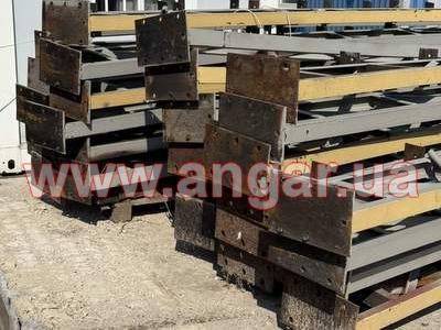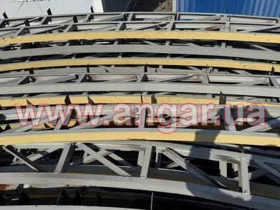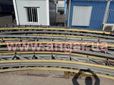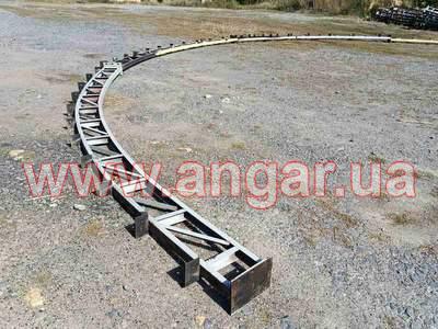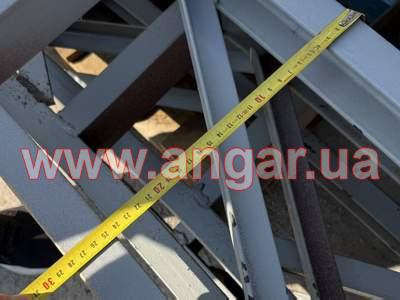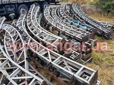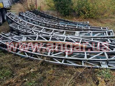 | Ангар арочного типу. Демонтований каркас. Металева ферма складається з 4 сегментів. Кожен з сегментів з двох катаних швелерів перерізом 65мм розварених між собою на відстані кутиками. Крок арок 3м. Кріплення до фундаментів на анкерах. Кріплення сегментів між собою на болтах. Довжина сегменту 5,6м, Ширина -0,28м. Конструкція складована і готова до відвантаження. |
