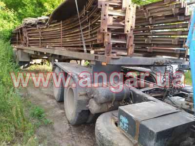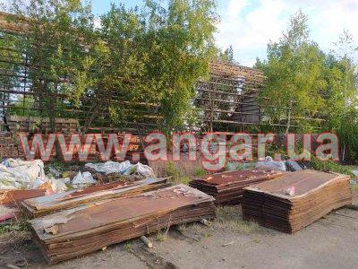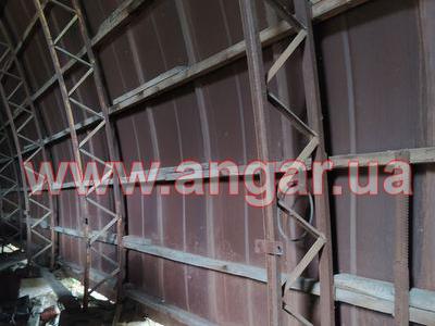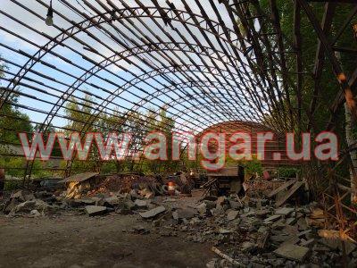 Ангар аркового типу. Демонтований. Металева арка складається з 4 сегментів. Кожен сегмент складається з двох швелерів перерізом 65мм розварених між собою на відстані кутниками. Всього 12 арок (48 сегментів). Обшитий металевим листом (на 1 торці листа немає). В комплекті 8 торцевих колон Каркас воріт розміром 4х4,3м