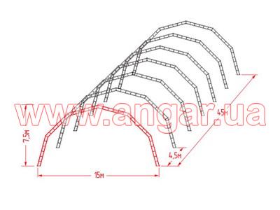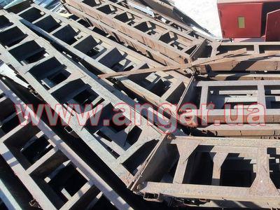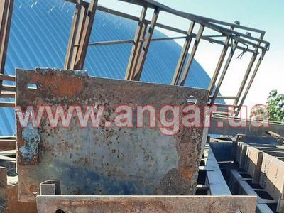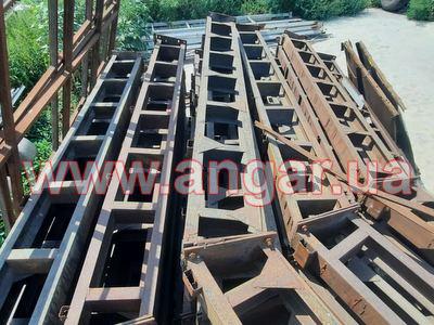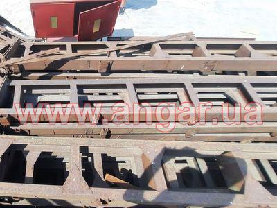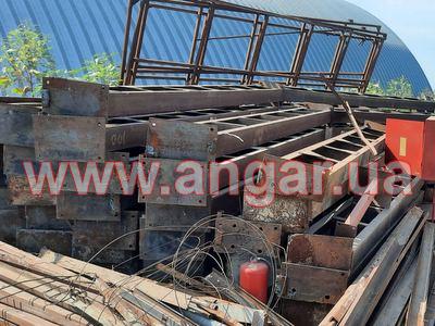 | Ангар аркового типу. Демонтований каркас. Металева ферма складається з 6 сегментів. Верхній та нижній пояс з двох швелерів перерізом 160мм зварених між собою на відстані. Розкоси також зі швелеру 160мм. Ширина сегменту 400мм. Крок арок 4,5м. Кріплення до фундаменту на закладних. Всього 11 арок. Сегменти скручені по парно. В комплекті каркас воріт розміром 4х4,5м, на 2 колони та ригель є швелер перерізом 160мм. Металоконструкція складована і готова до відвантаження. |