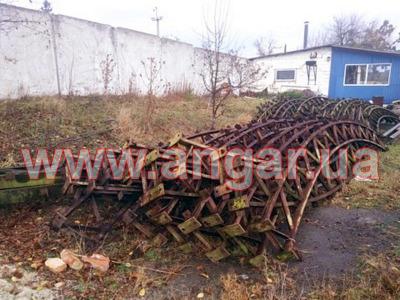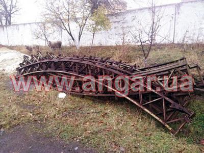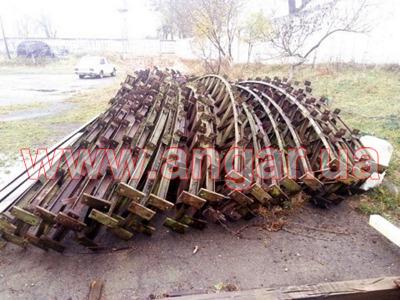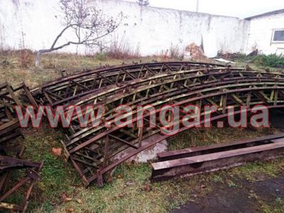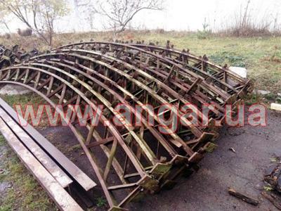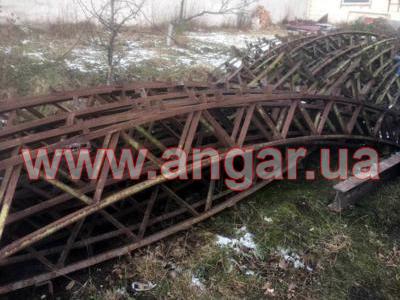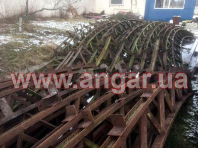 Ангар арочного типа. Демонтированный каркас. Разукомплектован. Всего 10 металлических арок. Шаг арок 3м. Каждая арка состоит из 4-х сегментов. Всего 40 сегментов. Верхний и нижний пояс каждого сегмента состоит из катаного швеллера сечением 65мм, расшитого между собой уголком. Торцевых колонн и ворот в комплекте нет. Ангар складирован и готов к погрузке.