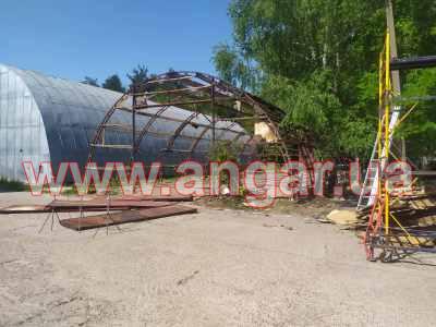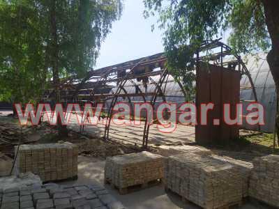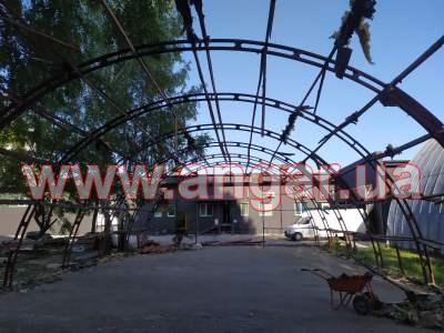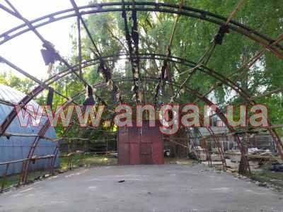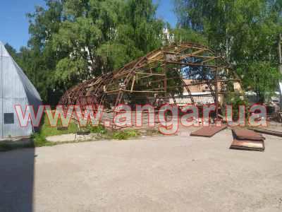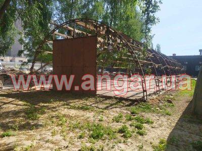 | Ангар аркового типу. Демонтований каркас. Металева ферма складається з 4 сегментів. Кожен сегмент з двох швелерів перерізом 60мм. Ширина сегменту 200мм. Торцеві колони зі швелеру перерізом 100мм. Всього 4 колони. Ворота розпашні розміром 4,2х4м. Конструкція демонтована і готова до відвантаження. |