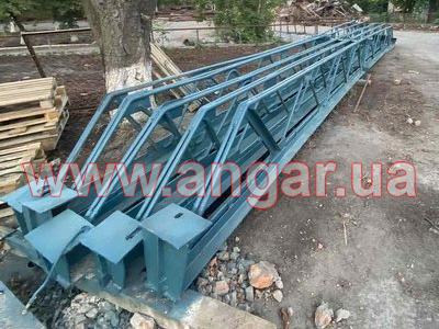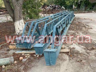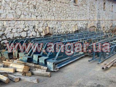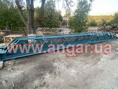 Ферма. Металева з паралельними поясами. Ширина ферми 13м. Висота 1м. Верхній пояс зі спареного 100 кутика. Нижній пояс зі спареного прутка перерізом 25мм. Розкоси з одинарного прутка перерізом 25мм. Вага 1 ферми до 600 кг. Всього 25 ферм.