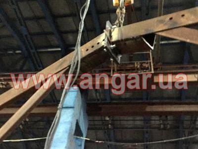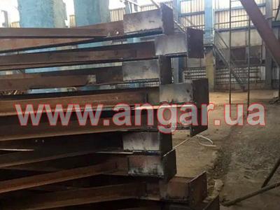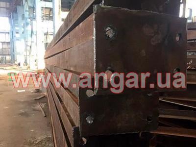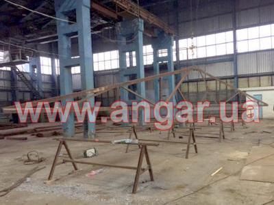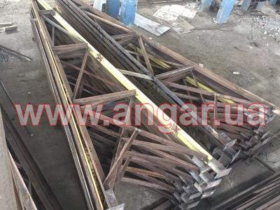 | Ферма. Металлическая, двускатная. Ширина 18м. Высота 2,25м. Разборная на болтовом соединении. Верхний и нижний пояс из уголка сечением 140х9мм, раскосы из уголка сечением 75, 90, 100мм. Шаг ферм 6м. Крепление к колоннам болтовое. Всего 26 шт. |