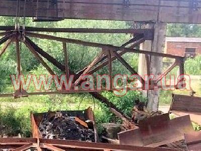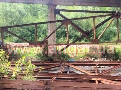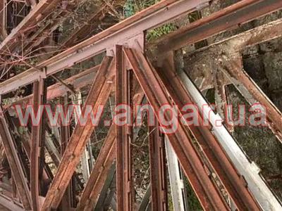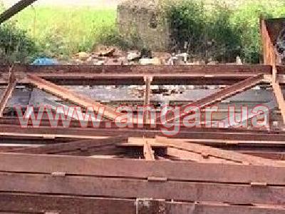 | Ферма. Металлическая, двускатная. Ширина 12м. Высота в центре 1,70м, высота по бокам фермы 0,95м. Верхний и нижний пояс из спаренного неравнополочного уголка сечением 100х60мм, раскосы из спаренного уголка сечением 75мм, 63мм. Крепление к колоннам сварное. Шаг ферм 6м. Вес одной фермы 1т. Всего 8шт. |