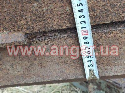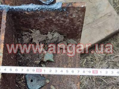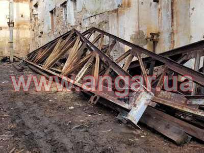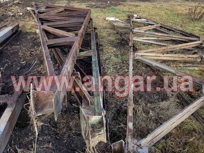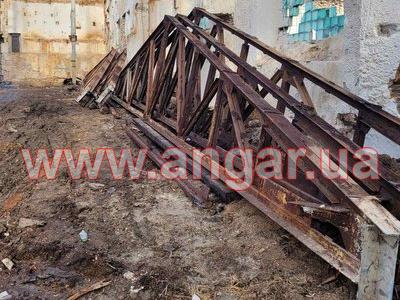 | Ферма металева. Двускатна. Цільнозварна. Верхній та нижній пояс спарений кутник перерізом 100мм. Розкоси спарений кутник перерізом 63мм. Всього 6 ферм. Висота в коньку 2,7м. Орієнтовна вага 1 ферми 1,6т. Загальна вага 9,6т. |
