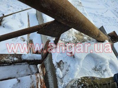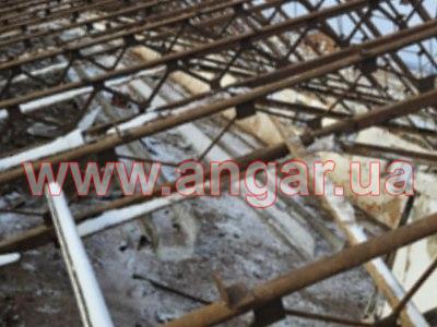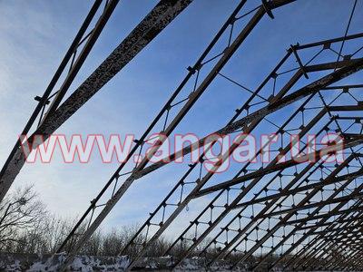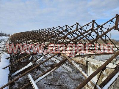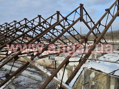 | Ферма. Металева двоскатна. Складається з двох напівферм. Ширина напівферми 550мм. Довжина 6,2м. Ширина зібраної ферми 11м. Висота 3м. Крок ферм 2м. Верхній пояс з круглої труби перерізом 57мм, товщина стінки 5мм. Нижній пояс гнутий швелер 50х100мм. Розкоси прут 22мм. Ферми між собою поєднуються поперечиною з кутика перерізом 63мм і довжиною 5м. Всього 71 ферма. |