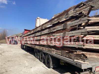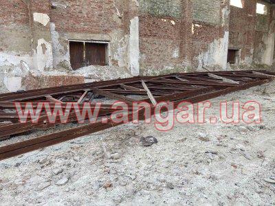 | Ферма металлическая двухскатная. Ширина пролета 24м. Разрезана на 2 полуфермы по 12м. Сварена из спаренных уголков сечением 110мм и 90мм. Высота в коньке 3,75м, высота по краю 2,3м. Вес одной фермы 2,6м. Всего 7 ферм (14 полуферм) Фермы складированы и готовы к погрузке.. |