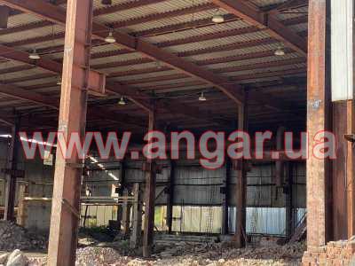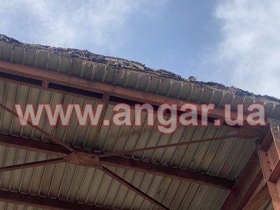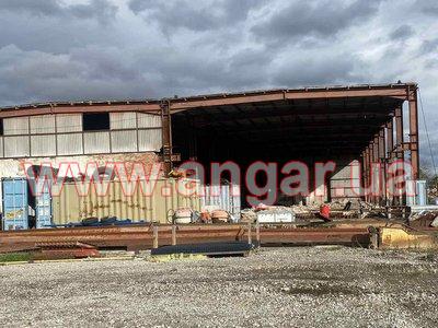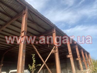 Ангар прямостінного типу. Встановлений каркас. Під складське або виробниче приміщення. Два прольоти по 18м. Висота 9м. Колони виготовлені з двотавра перерізом 500х300х12мм. Опорна пластина товщиною 30мм. Крок колон 6м. Кріплення до фундаменту на анкерах. Всього 24 колони. Покрівельні балки з двотарву перерізом 500х250х10мм. Кріплення між собою таф до колон на болтах. Всього 32 балки. Покрівельні прогони зі швелеру перерізом 240мм товщина стінки 7мм. Всього 1344 м.п. На покрівлі несучий профлист товщиною 1,5мм (зверху пиріг з ППУ та руберойду)