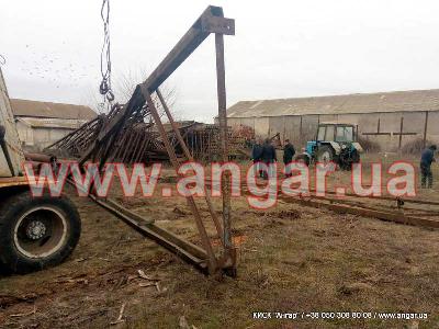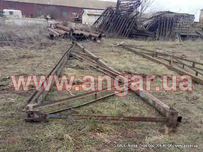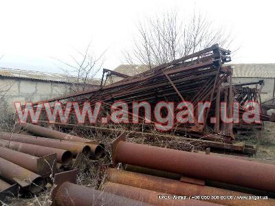 Ангар прямостенного типа. Демонтированный каркас. Однопролетный. Двускатный. Под складское помещение. Колонны из трубы сечением 273мм стенка 7-8мм. Опорные пластины срезаны. Пластины для крепления ферм в наличии. Шаг колонн 3м. Всего 40 колонн. Ферма из двух полуферм. Крепление ферм между собой болтовое. Крепление ферм к колоннам сварное. Верхний пояс из двух швеллер сечением 120мм сваренных в коробку нижний пояс из двух швеллеров приваренных по бокам к верхнему поясу. Раскосы из уголка. Всего 40 полуферм. 20 ферм. Ангар складирован и готов к погрузке.