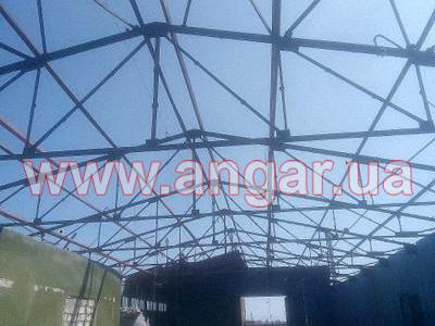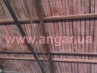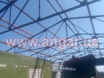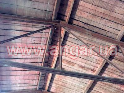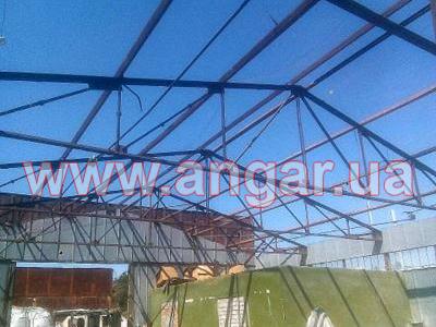 | Ангар прямостенного типа. Установленный каркас. Колонны из спаренного швеллера сечением 100мм. Всего 12 колонны. Шаг колонн 3м. Высота колонны 3,60м. Крепление к фундаментам - забетонированы. Фермы цельносварные. Верхний пояс из спаренного уголка сечением 63мм, нижний пояс из спаренного уголка сечением 45мм, раскосы из спаренного уголка сечением 25мм, 35мм. Высота фермы 1,74м. Всего 11 ферм. Кровельные прогоны из швеллера сечением 80мм. Всего 240 м.п. (8 рядов). В комплекте двое торцевых распашных ворот размером 3,20х3,30м. Одни фасадные распашные ворота размером 2х2м. |