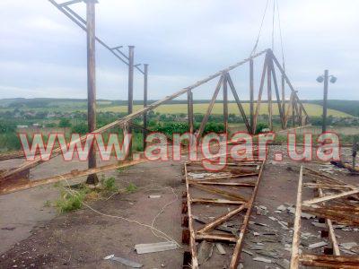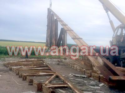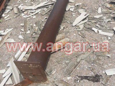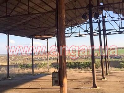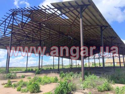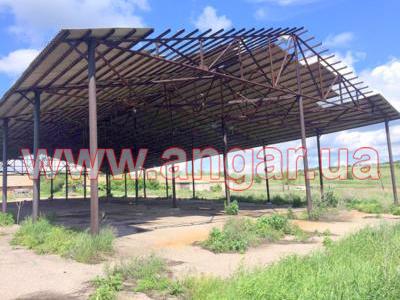 | Ангар прямостенного типа. Каркас навеса. Демонтирован. Двускатный. Двупролётный. Колонны из трубы сечением 219мм. Высота колонны 6м. Шаг колонн 6м. Всего 27 шт. Колонны забетонированы. Ферма двускатная. Цельносварная. Верхний, нижний пояс и раскосы из спаренного уголка сечением 75мм. Шаг ферм 6м. Высота фермы 3м. Крепление к колоннам сварное. Кровельные прогоны из швеллера сечением 100, 120мм. Всего 1824 м.п. (38 рядов). |