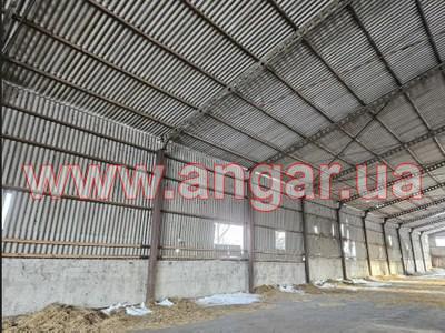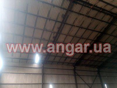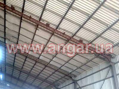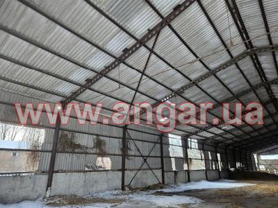 | Ангар прямостінного типу. Встановлений каркас. Під складське приміщення. Колони з 219 труби. Товщина стінки 6мм. Кріплення до фундаментів на закладних. Крок колон 6м. Всього 26 колон. Ферма зроблена з двох полегшених балок перерізом 300мм, між якими встановлена затяжка з 22 прута. (всього 26 напівферм). Кріплення балок між собою та до колон болтове. Прогони з кутика 70мм. В кутик вкладений брус. По торцях розсувні ворота розміром 8м (ширина) х 6м (висота). Ворота розукомплектовані, не вистачає по 1 стулці з кожного боку. |