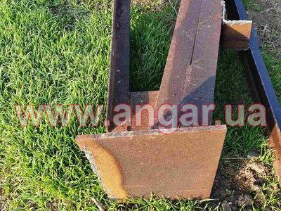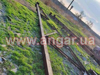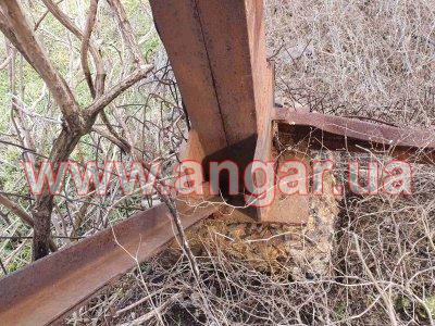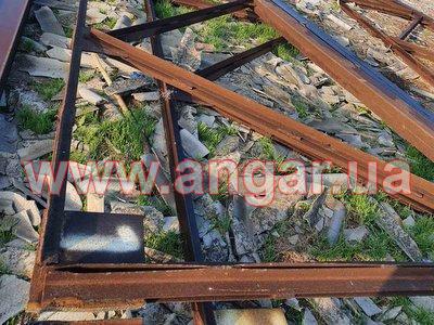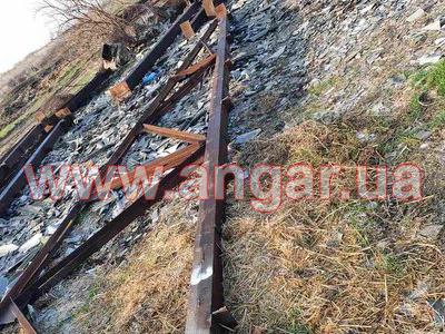 Ангар прямостенного типа. Демонтированный каркас. Колонны из спаренного швеллера сечением 180мм. 3 колонны из 36 двутавра. Шаг колонн 6м. Всего 20 колонн. Крепление к фундаментам на закладных. Торцевые колонны из 36 балки. Всего 8шт. Фермы шириной 18м. Верхний пояс из из спаренного швеллера сечением 140мм. Нижний пояс и расскосы из спаренного уголка сечением 50мм. Крестовые связи из уголка сечением 50мм. Связь по верху колонн уголок сечением 75мм. Прогоны комбинированные: частично гнутый швеллер сечением 100мм, частично уголок 50мм сваренный в швеллер. Всего 14 рядов.