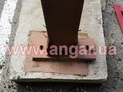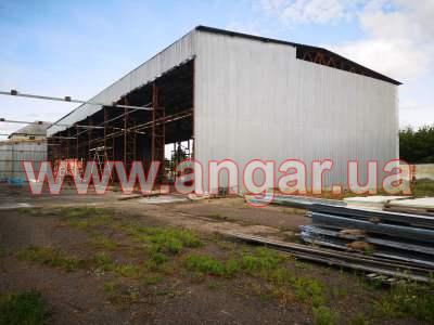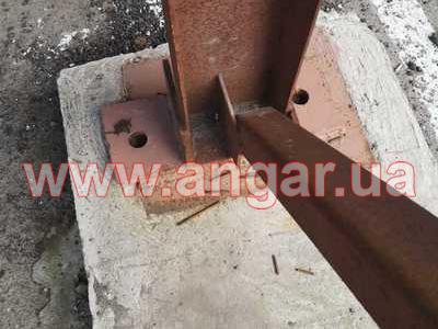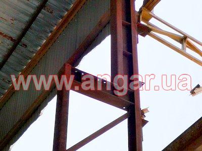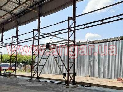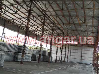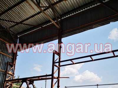 | Ангар прямостенного типа. Установленный каркас. Двускатный и двухпролетный. Колонны центрального ряда сложного сечения 400х400мм из уголка сечением 50мм. Шаг колонн 6м. Всего 8шт. Колонны бокового ряда из гнутого швеллера сечением 160мм сваренного на расстоянии 1000мм швеллером такого же сечения и уголком. Шаг колонн 6м. Всего 20шт. Торцевые колонны из трубы диаметром 150мм. Всего 6шт. Крепление колонн к фундаментам на закладных. Внутренние фермы 8шт. Верхний пояс из спаренного уголка сечением 100мм, толщина стенки 8мм. Нижний пояс и раскосы из спаренного уголка сечением 75мм, толщина стенки 8мм. Торцевые фермы из спаренного уголка сечением 75мм, толщина стенки 5мм. Крепление ферм к колоннам сварное. Кровельные прогоны 70% процентов металлические: профиль сечением 120мм, толщина стенки 4мм. и гнутый швеллер сечением 120мм, толщина стенки 3мм, и 30% - брус |