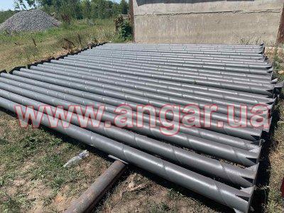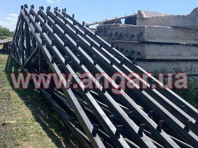 Ангар прямостінного типу. Лежалий каркас. Колони вироблені з труби перерізом 159мм. Стінка 5мм. Крок колон 4м. Всього 24шт. Висота колони 6м. Кріплення до фундаментів зварне на закладних. Ферми двоскатні цільнозварні виготовлені з труби 80х60х3мм. Крок ферм 4м. Кріплення до колон зварне. Всього 12 ферм. Конструкція складована та готова до відвантаження
