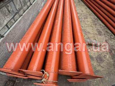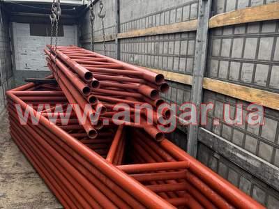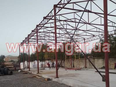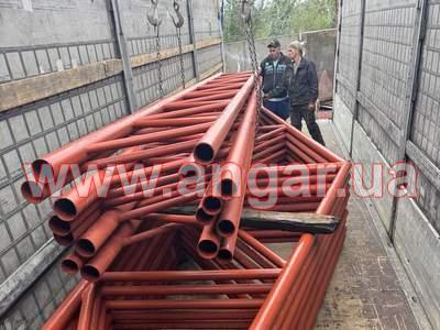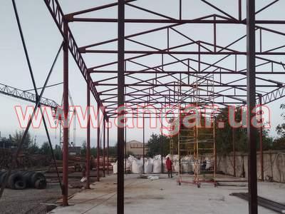 | Ангар прямостінного типу. Колони зі 159 труби, стінка 5-6мм. Висота колони 6,0м. Крок колон 6м. Всього 10 колон. Ферми двоскатні цільнозварні з круглої 89 труби стінка 4,5мм, розкоси з труби 76мм стінка 4мм. Крок ферм 3м. Всього 9 ферм. Підкроквяна ферма 5,84м. Верхній пояс з труби перерізом 89мм, стінка 4,5мм, нижній пояс з труби 76мм, стінка 4мм, розкоси з труби 42мм, стінка 4мм. Всього 8 підкроквяних ферм. Конструкція складована і готова до відвантаження. |