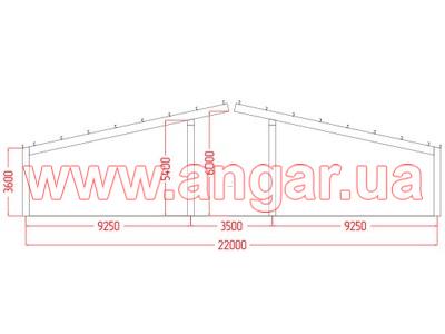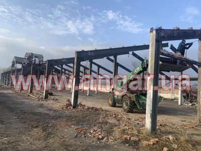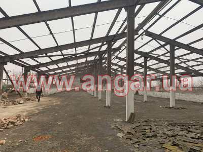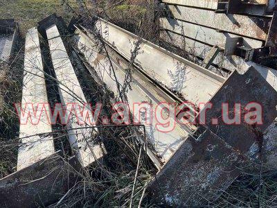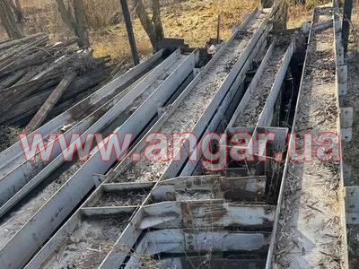 | Ангар прямостінного типу. Демонтований каркас. Трьохпролтіний. Бокові прольоти по 9,25м, центральний проліт - 3,5м. Колони з двотаврової балки перерізом 340х250мм. Крок колон 6м. Кріплення до фундаментів на закладних. Всього 22 колони бокового ряду (L=3.60м), та 22 колони внутрішнього ряду (L=5.40м). Покрівельні кроквяні балки з двотаврової балки перерізом 440х180мм. Кріплення до колон на болтах. Всього 22 покрівельні балки. Покрівельні прогони - гнутий швелер перерізом 160мм. Всього 20 рядів. (1200 м.п.). Кріплення до балок на болтах. Орієнтовна вага каркасу 50+т. Каркас демонтований, складований і готовий до відвантаження. |