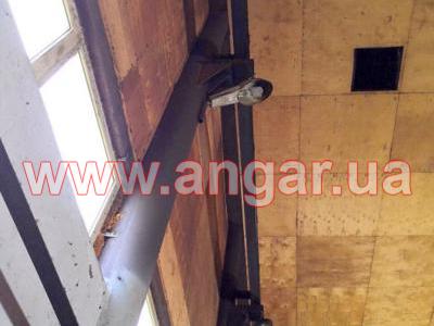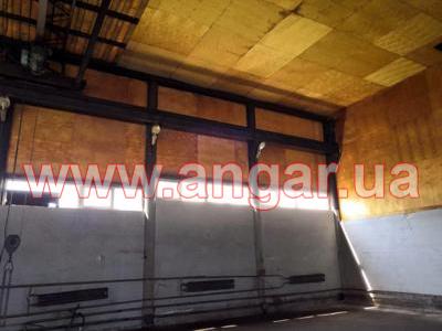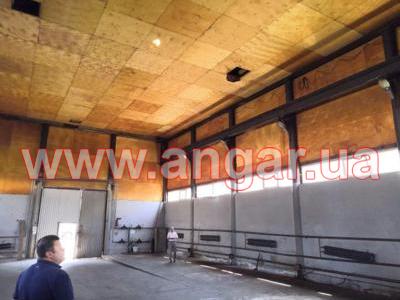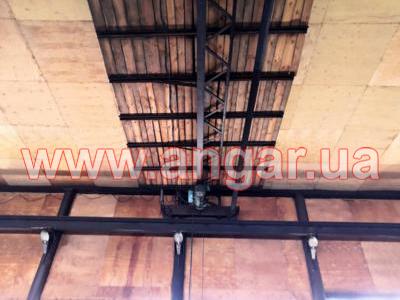 | Ангар прямостенного типа. Установлен в полной комплектации. Колонны из трубы сечением 325мм. Всего: 18шт. – несущие колонны, 3шт. – торцевые колонны. Шаг колонн 4м. Высота колонны 7,5м. Крепление к фундаментам на анкерах. На высоте 6м установлена кран балка грузоподъемностью 2т. Подкрановый путь из двутавровой балки сечением 300мм. Фермы цельносварные. Верхний, нижний пояс и раскосы из спаренного уголка. Крепление к колоннам сварное. Всего 9 ферм. Обшит ангар оцинкованным листом. Высота волны 80мм, толщина металла 1.2мм. По двум сторонам ангара предусмотрена полоса остекления. В комплекте торцевые распашные ворота размером 3х4м. Вес конструкции около 27т. |
