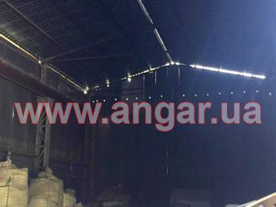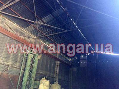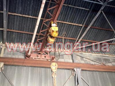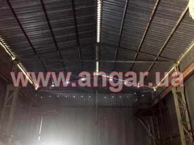 |  Ангар прямостенного типа. Установлен в полной комплектации. Колонна сложного сечения. Одна стенка колонны состоит из двух швеллеров сечением 140мм сваренных на расстоянии пластинами из листового металла, вторая стенка колонны из двутавровой балки сечением 270мм, две стенки между собой сварены уголком. Надколонник длиной 1800мм, из двух швеллеров сечением 140мм сваренных на расстоянии пластинами из листового металла. Всего 14 колонн. Шаг колонн 6м. Крепление к фундаментам на анкерах. Фермы цельносварные. Верхний пояс из спаренного швеллера сечением 100мм, нижний пояс из спаренного уголка сечением 80мм. Крепление к колоннам сварное. Высота фермы 1,50м. Всего 7 ферм. Кран балка грузоподъёмностью 5т, установлена на высоте 7м. Подкрановый путь из двутавровой балки сечением 450х150мм, сверху подкранового пути установлен 24 рельс. Кровельные прогоны из швеллера сечением 140мм. Всего 360м.п. Стеновые прогоны из швеллера сечением 140мм. Всего 400м.п. Обшит ангар профнастилом. Всего 1282м2. В комплекте одни распашные, фасадные ворота. |