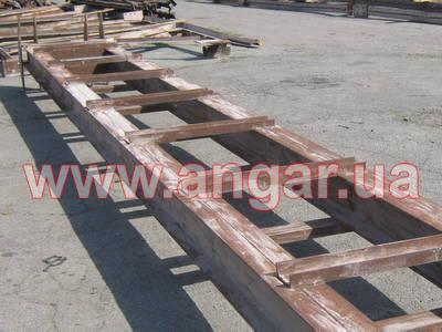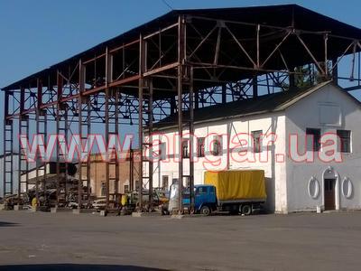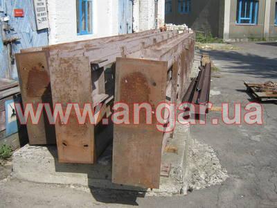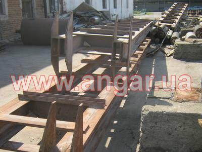 Ангар прямостенного типа. Демонтированный каркас. Колонны из четырех швеллеров сечением 240мм: по два швеллера сваренные в виде двутавра, потом эти двутавры разварены на расстоянии швеллером сечением 120мм. Всего колонн 16шт. Шаг колонн 6м. Крепление к фундаментам на анкерных болтах. На колонны устанавливаются надколонники из двутавра сечением 440мм. Всего надколонников 16шт. Крепление надколонников к колоннам на болтовом соединении. Ферма цельносварная. Верхний и нижний пояса фермы из спаренного равнополочного уголка 110х110мм. Раскосы фермы из спаренных равнополочных уголков 90х90мм и 75х75мм. Шаг ферм 6м. Всего ферм 8шт. Крепление ферм с подколонниками на болтовом соединении. Подколонники между собой вдоль ангара соединены двутавром сечением 300мм (по низу подколонников) и швеллером сечением 180мм (по верху подколонников). Кровельные прогоны из швеллерра сечением 160мм. Всего кровельных прогонов 10 рядов (420м.п). Вес около 70т.