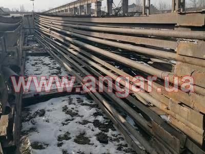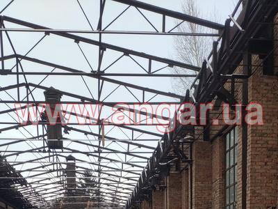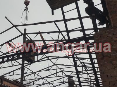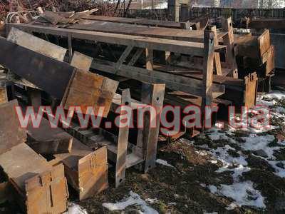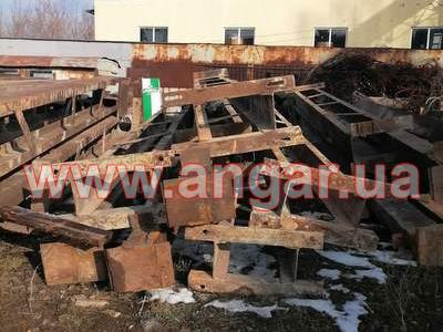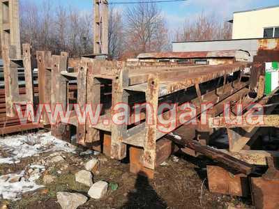 | Ангар прямостінного типу. Демонтований каркас. Колони складного перерізу. Нижня частина (L=6,0м), виконана з двох швелерів перерізом 300мм розварених між собою на відстані 600 мм пластиною з листового металу товщиною 10мм. Верхня частина (L=1,5м) перерізом 300х200мм з двох швелерів зварених в коробку. Загальна висота колон 7,5м. Крок колон 6м. На висоті 6,0м були встановлені дві кран балки. Перша на 3,2т, інша на 5т. Ферми цільнозварні двох видів (однаковий розмір, різний матеріал) Перший вид: Верхній та нижній пояс зі спареного кутика перерізом 70мм, розкоси з подвійної арматури перерізом 28мм. Другий вид: Верхній та нижній пояс з труби перерізом 76мм, розкоси з подвійної арматури перерізом 28мм. Висота ферм 1,8м. Крок ферм 3м. Всього 28шт. Підкроквяна балка зі швелеру перерізом 300мм. Всього 152м.п. Ангар демонтований, складований та готовий до відвантаження. |