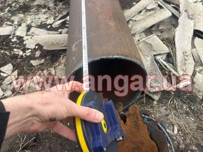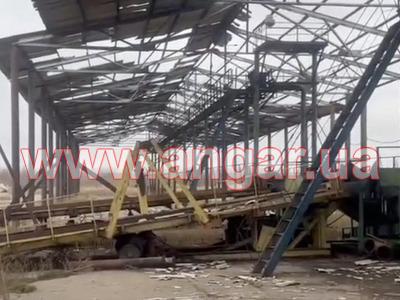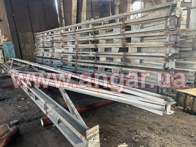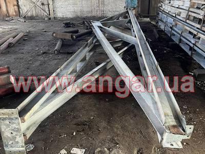 | Ангар прямостінного типу. Демонтований каркас. Під складське, або виробниче приміщення. Колони з труби перерізом 325мм, стінка 8мм. Крок колон 6м. Довжина колони 7,5м. Нижні опорні пластини обрізані. Ферма двоскатна. Оцинкована. Верхній пояс з двох швелерів перерізом 100мм зварених між собою на відстані пластинами. Нижній пояс та розкоси одинарний швелер перерізом 100мм. Ферма розрізана на дві напівферми і по низу зварюється Покрівельні прогони з катаного швелеру перерізом 100мм. Всього 16 рядів. |