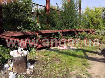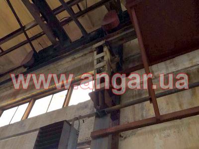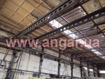 Ангар прямостенного типа. Установленный каркас. Колонны из двутавровой балки 40Ш2.Всего 18 колонн. Крепление к фундаментам на 4 анкерных болтах Шаг колонн 6м. Всего 18 несущих колонн. Фермы шириной 18м состоят из двух полуферм по 9м. Крепление полуферм между собой на болтовом соединении. Верхний пояс из двух швеллеров сечением 240мм сваренных в коробку. Нижний пояс из двух равнополочных уголков сечением 125х10мм. Раскосы из уголков сечением 50мм и 70мм. Крепление к колоннам на болтовом соединении. Всего 9 ферм (18 полуферм) На высоте 6м установлены две кран балки грузоподъемностью 5т. (тельфера нет). Подкрановый путь из двутавровой балки 36м и рельса Р24. Прогоны по кровле 3 ряда из 16 швеллера сваренного в коробку.