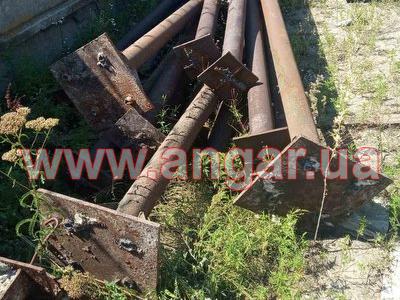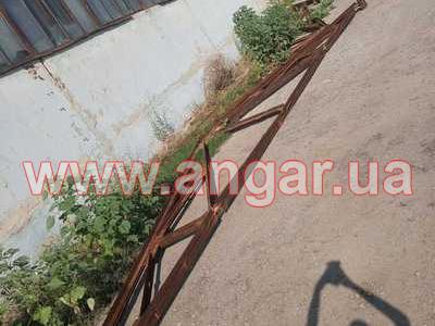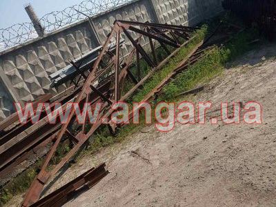 | Ангар прямостінного типу. Демонтований каркас. Колони з труби перерізом 127мм, товщина стінки 10мм. Крок колон 4м. Кріплення до фундаментів на закладних. Всього 18 колон. Ферми металеві двоскатні. Верхній та нижні пояс зі спареного швелера перерізом 63мм. Розкоси зі спареного кутника перерізом 45мм. Кріплення до колон на зварці. Всього 9 ферм. Каркас демонтований, складований і готовий до відвантаження. |
