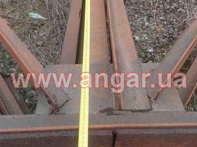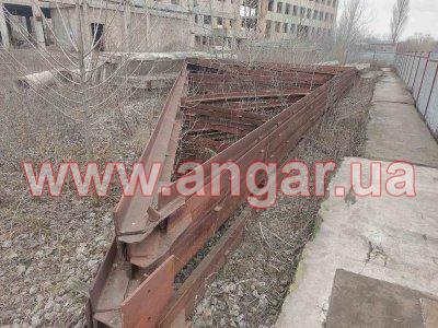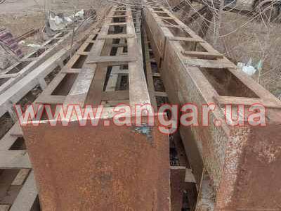 | Ангар прямостінного типу. Демонтований каркас. Під складське (склад) чи виробниче (цех) приміщення. Колони з двох швелерів перерізом 220мм, зварених між собою на відстані пластинами. Довжина колони 6м. Крок колон 6м. Кріплення до фундаментів на анкерах. Всього 10 колон. Ферми двоскатні цільнозварні. Верхній та нижній пояс зі спареного кутника перерізом 90мм, розкоси зі спареного кутника перерізом 64мм. Всього 5 ферм. Кріплення ферм до колон зварне. Ангар демонтований, складований і готовий до відвантаження. |