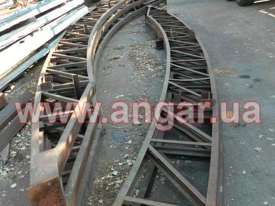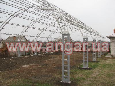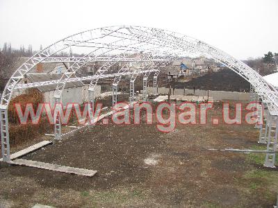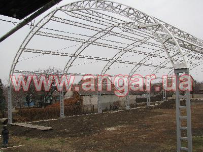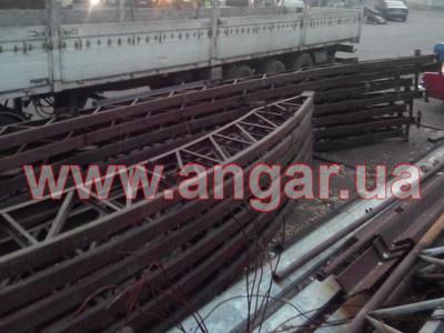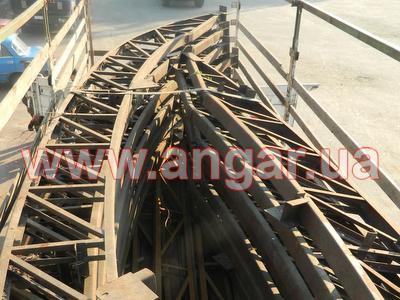 | Ангар арочного типа. Изначально продавался как демонтированный каркас. После продажи был перевезен в Кировоградскую область. Перед монтажом конструкцию почистили и покрасил. При монтаже ангар расширили (изначально был 15м., расширили до 18м.) и установили на колонны, что позволило получить дополнительный запас по высоте. |