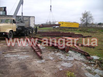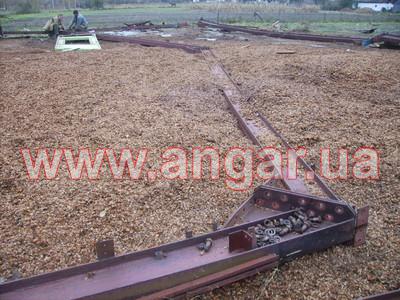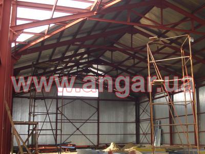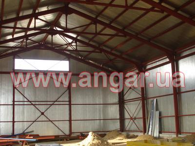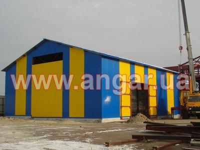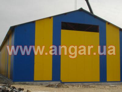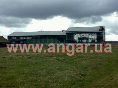 Ангар прямсотенного типа. Изначально использовался как цех по переработке хмеля. Находился в Житомирской области. После демонтажа был перевезен в Киевскую область и доукомплектован ограждающим листом с полимерным покрытием. После монтажа используется как швейных цех.