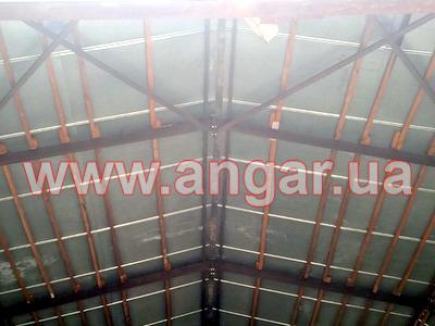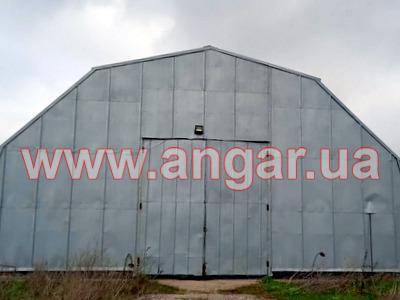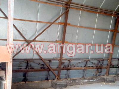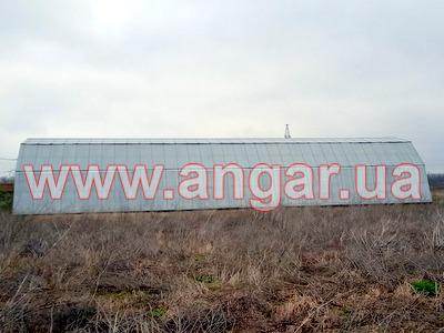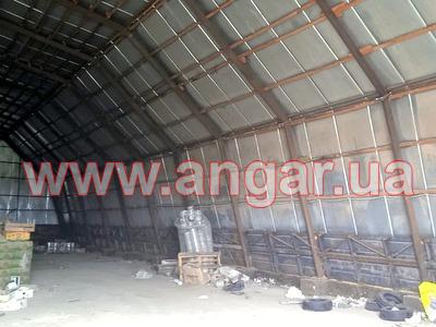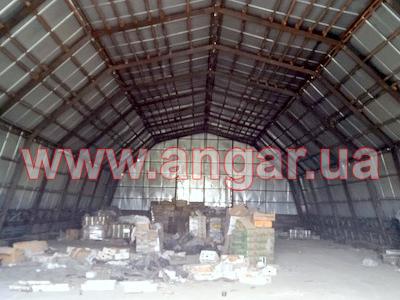 Ангар арочного типа. Установлен в полной комплектации. Металлическая арка состоит из 6 сегментов. Каждый сегмент из швеллера сечением 140мм. Крепление сегментов между собой при помощи фланцев на болтах. Крепление к фундаментам на закладных. Шаг арок 3.5м. Всего 12 арок. Обшит оцинкованным листом. Двое сквозных торцевых распашных ворот размером 4х4,5. По низу ангара с двух сторон идут связи из уголка в каждом пролете. В крайних пролетах установлены крестовые связи.