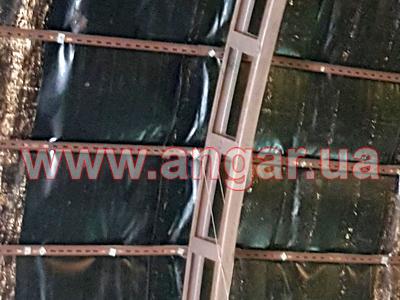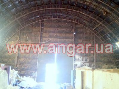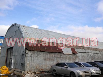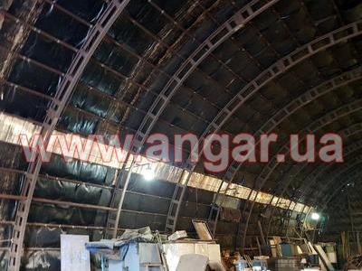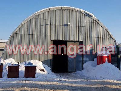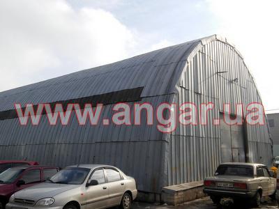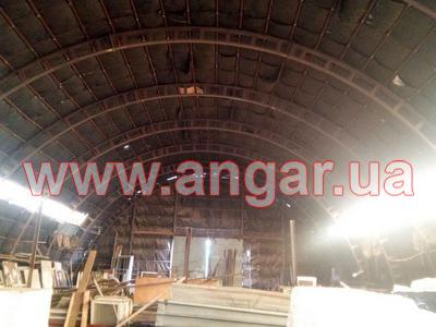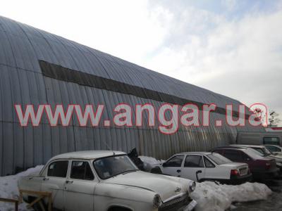| Ангар арочного типа. Установлен в полной комплектации. Всего 12 металлических арок. Арки установлены с шагом 3м. Каждая арка состоит из 5 сегментов. Всего 60 сегментов. Верхний и нижний пояс каждого сегмента состоит из катаного швеллера сечением 100мм, расшитого между собой пластинами из листового металла. Прогоны из швеллера (с просечкой) сечением 50мм. Всего 8 торцевых колонн из швеллера сваренного в коробку сечением 120мм. В комплекте двое торцевых раздвижных ворот размером 4х4м. Ангар обшит оцинкованным листом размером 0,9мх1,9м. Толщина металла 0,7мм. |
