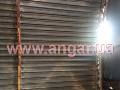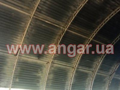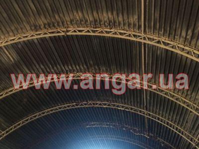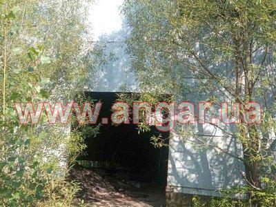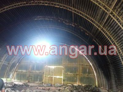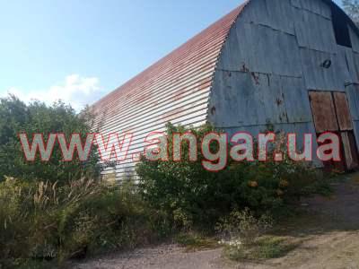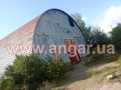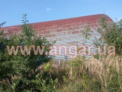 Ангар аркового типу. Встановлений. Металева арка (ферма) складається з чотирьох сегментів. Кожен з сегментів зварений з двох швелерів перерізом 80мм розварених між собою кутником. Всього 11 арок (44 сегменти). Обшитий профлистом товщиною 0,8мм. Висота хвилі 60мм. Профлист кріпиться до арок вздовж ангару. В комплекті 8 торцевих колон та одні ворота 4х4м. Не вистачає кількох торцевих листів та одних воріт.