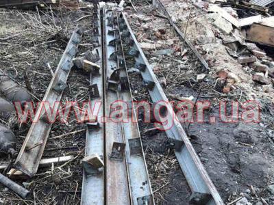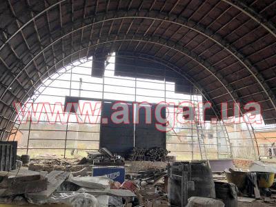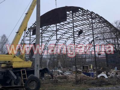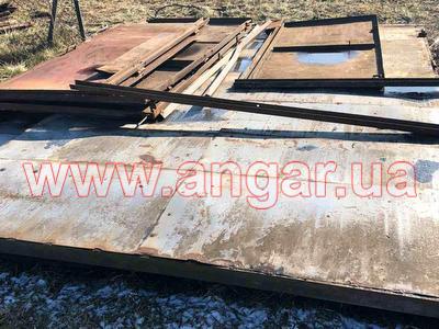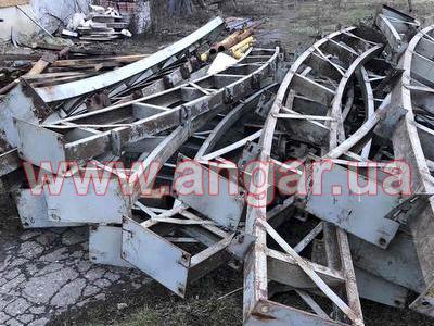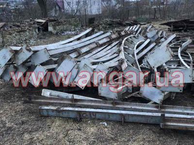 | Ангар арочного типа. Демонтированный каркас. Всего 11 металлических арок. Шаг арок 3м. Каждая арка состоит из 6 сегментов. Всего 66 сегментов. Верхний, нижний пояс и раскосы из катаного швеллера сечением 100мм. Всего 8 торцевых колонн из профильной трубы. В комплекте двое торцевых раздвижных ворот размером 6х6м, под них есть рельсы из швеллера сечением 240мм. Также в комплекте двое распашных фасадных ворот размером 3,5х3,5м и 2,3х3м. На сегментах, которые были забетонированы в фундамент отрезаны пятки, всего 22 штуки отрезанных пяток. |