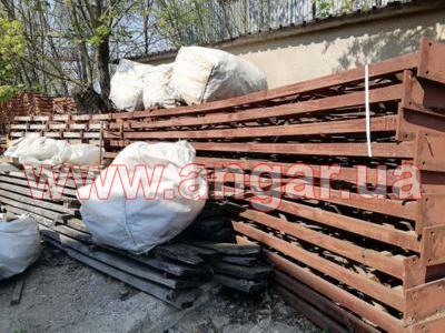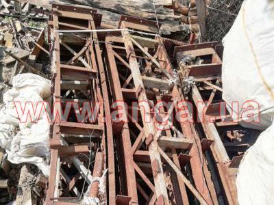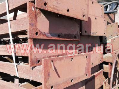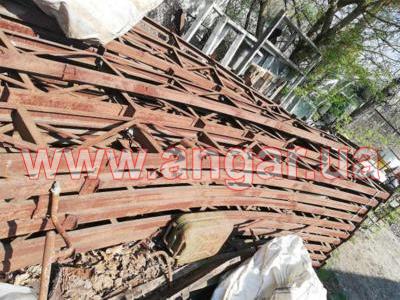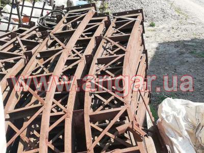 Ангар арочного типа. Демонтированный каркас. Всего 11 металлических арок. Арки устанавливаются с шагом 3м. Каждая арка состоит из 4-х сегментов. Всего 44 сегмента. Верхний и нижний пояс каждого сегмента состоит из катаного швеллера сечением 65мм, расшитого между собой катаным швеллером сечением 65мм и пластинами из листового металла. Торцевые колонны и ворота в комплекте отсутствуют.