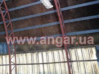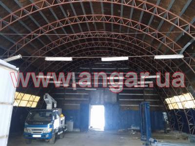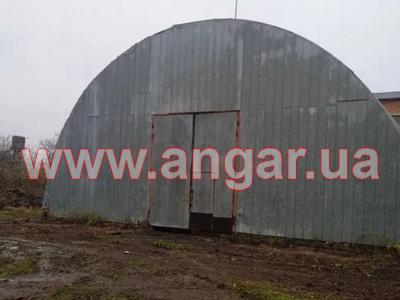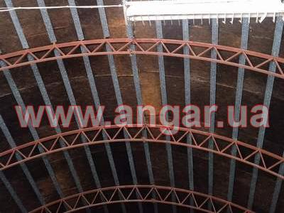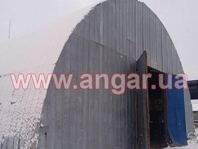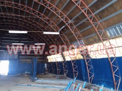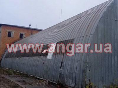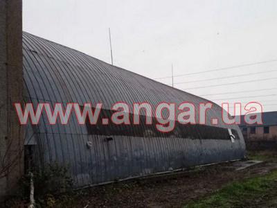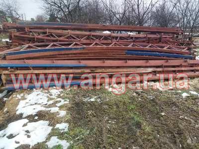 | Ангар аркового типу. Демонтований в повній комплектації. Металева арка складається з 4 сегментів. Нижні сегмент: верхній пояс профільна труба 40х40, нижній пояс профільна труба 80х40, розкоси профільна труба 30х30. Верхні сегменти навпаки нижній пояс з профільної труби 40х40, верхній пояс з профільної труби 80х40, розкоси з профільної труби 30х30мм. Всього 11 арок. (44 сегменти) Крок арок 3м. Обшитий оцинкованим листом. Товщина біля 1мм. 4 торцевих колон зі швелеру перерізом 160мм. 2 торцевих розпашних воріт розміром 3,5х4,0м |