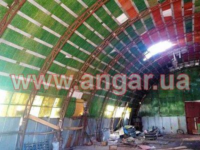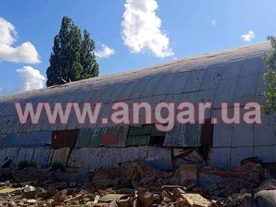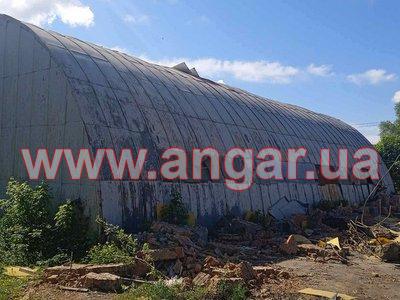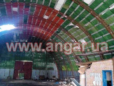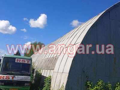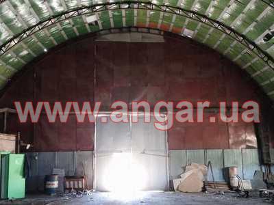 Ангар аркового типа. Встановлений в повній комплектації. Металева ферма (арка) складається з чотирьох сегментів. Кожен сегмент з двох катаних швелерів перерізом 65мм зварених між собою на відстані. Кріплення сегментів між собою болтове. Ангар обшитий оцинкованим листом товщиною 0,8мм. В ангарі двоє торцевих розпашних воріт розміром 4х4м.
