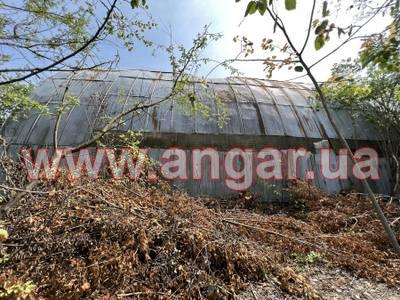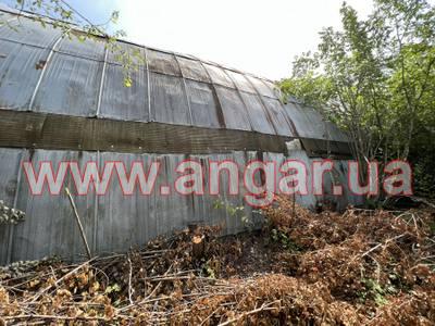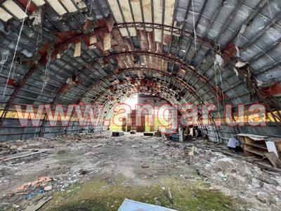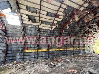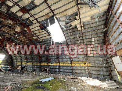 Ангар аркового типу. Встановлений розукомплектований. Металева арка (ферма) складається з 4 сегментів. Кожен з сегментів зварений з двох швелерів перерізом 80мм, які розварені між собою кутником. Всього 11 арок (44 сегменти) В комплекті 8 торцевих колон. Обшитий профлистом. Не вистачає 20-25 листів.