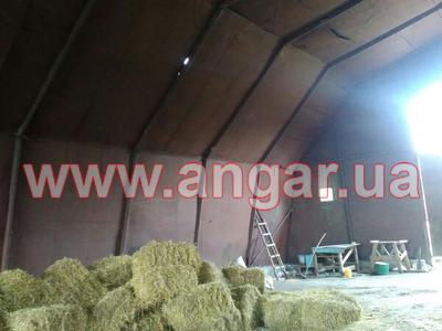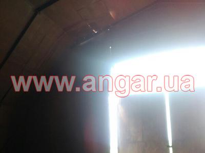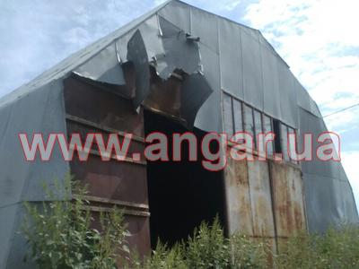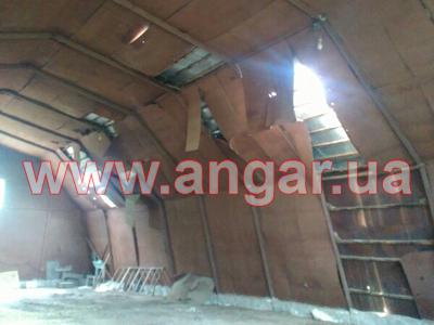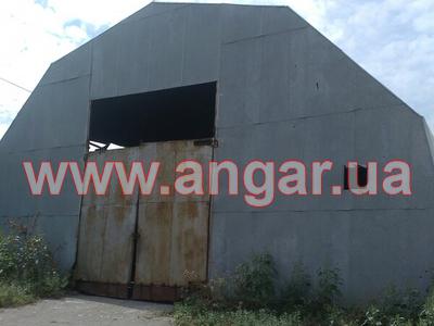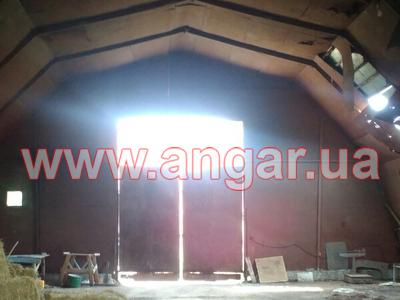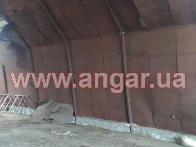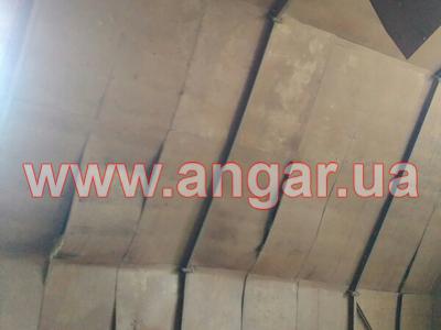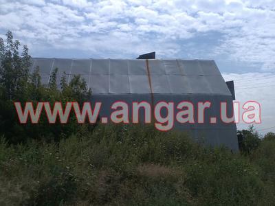 Ангар арочного типа (полигональный). Установлен. Металлическая ферма (арка) состоит из 6 сегментов. Сегменты состоят из катанного швеллера сечением 120мм. Всего 11 арок (66 сегментов). Прогоны из бруса. В комплекте двое торцевых распашных ворот размером 4х4м (нет еще одних ворот). Снаружи ангар обшит оцинкованным листом (не хватает примерно 20 листов обшивки)