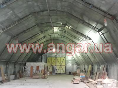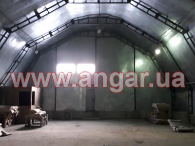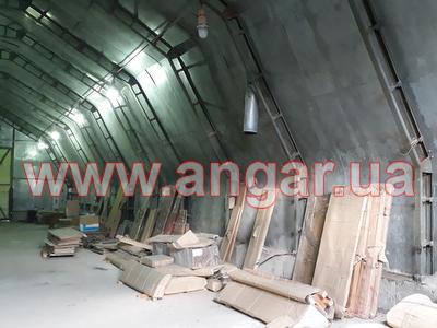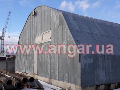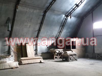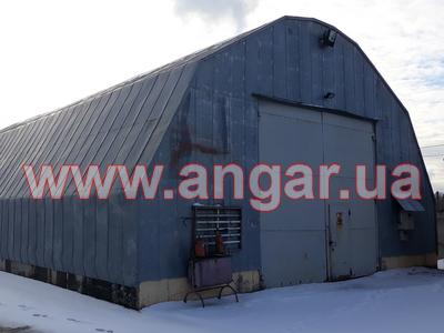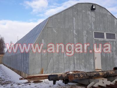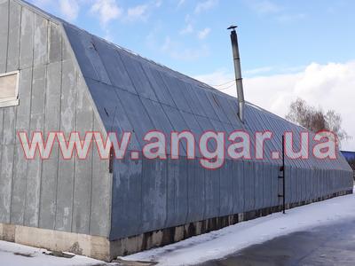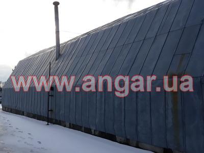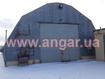 | Ангар аркового типу. Встановлений в повній комплектації. Металева арка складається з трьох сегментів. Верхній, нижній пояс та розкоси кожного з сегментів зі швелеру перерізом 100мм. Всього 13 арок (39 сегментів). Кріплення сегментів між собою на болтах, кріплення сегментів до фундаментів - зварне. Обшитий оцинкованим листом в два шари, між якими знаходиться утеплювач в матах з мішковини. Зовнішній лист товщина 1мм, внутрішній лист товщина 0,6мм. Дерев`яний брус перерізом 50х70мм. Одні торцеві ворота розміром 4,2х4,7м. з іншого торця є вхідні двері. та вікна розміром 2,87х0,7м |