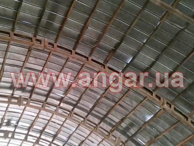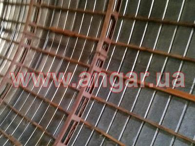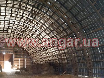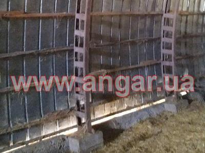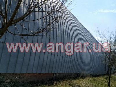 | Ангар арочного типа. Установлен, разукомплектован. Всего 7 металлических арок. Арки установлены с шагом 3м. Каждая арка состоит из 5 сегментов. Всего 35 сегментов. Верхний и нижний пояс каждого сегмента состоит из катаного швеллера сечением 80мм, расшитого между собой пластинами из листового металла. Крепление арок к фундаменту на сварке. Всего 4 торцевые колонны. В комплекте одни торцевые распашные ворота размером 4мх4,5м. Ангар обшит оцинкованным листом размером 1мх2м. Толщина металла 1,2мм. |