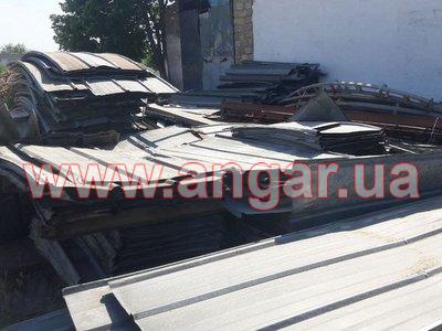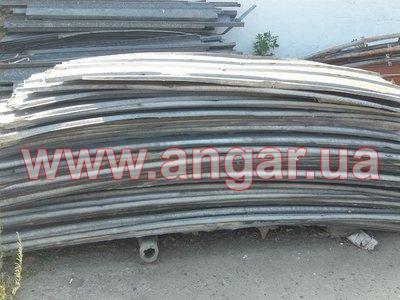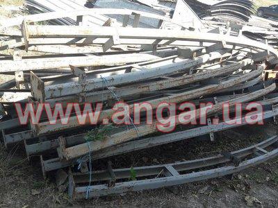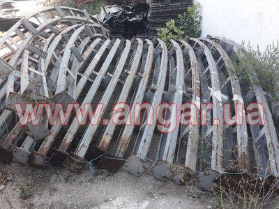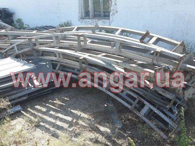 Ангар арочного типа. Демонтирован в полной комплектации. Всего 10 металлических арок. Шаг арок 3м. Каждая арка состоит из 4-х сегментов. Всего 40 сегментов. Верхний и нижний пояс каждого сегмента из гнутого швеллера сечением 70мм, расшитого между собой пластинами из листового металла. Ширина сегмента 20см. Обшит оцинкованным листом размером. Конструкция демонтирована и готова к погрузке.