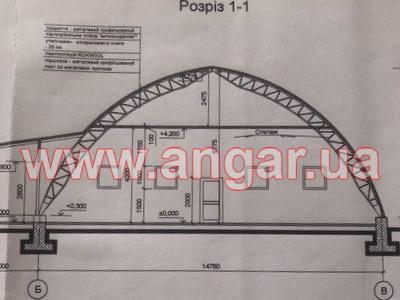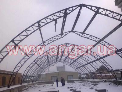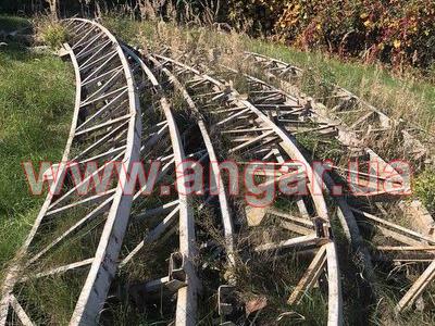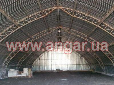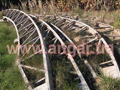 | Ангар аркового типу. Каркасно-тентова конструкція. Як огороджувальні конструкції можна використовувати або тент, або оцинкований профлист. Металева ферма складається із двох сегментів. Верхній та нижній пояс сегмента з гнутого швелера перерізом 120х50мм, розкоси з рівнополочного кутника перерізом 30х30мм. Усього 14 сегментів. Кріплення сегментів між собою на болтовому зєднанні. Болти в комплекті. Крок ферм 6м. Прогонів в комплекті немає. |