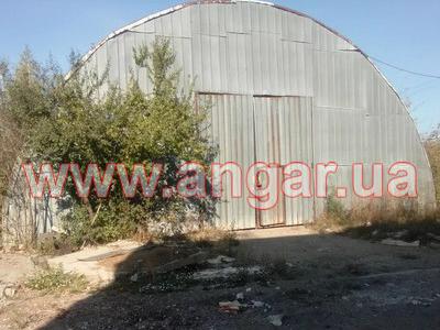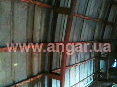 | Ангар арочного типа. Установлен в полной комплектации. Всего 11 металлических арок. Арки установлены с шагом 3м. Каждая арка состоит из 5 сегментов. Всего 55 сегментов. Верхний и нижний пояс каждого сегмента состоит из гнутого швеллера сечением 100мм, расшитого между собой пластинами из листового металла. Всего 8 торцевых колонн из швеллера сечением 100мм сваренного в коробку. В комплекте торцевые распашные ворота размером 4мх5м. Ангар обшит оцинкованным листом размером 1,05мх2м. Толщина металла 0,8мм. |